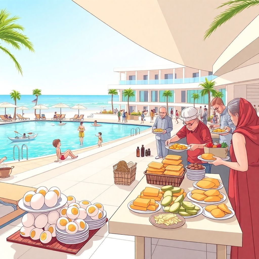 Путешественница рассказала, что в основном вопросы у нее вызвала старшая возрастная категория туристов — примерно от 45 лет и старше. Некоторые из них, по ее наблюдениям, складывали в тарелки и контейнеры яйца, огурцы и другие продукты, а затем уносили это все с собой к бассейну, превращая зону у воды в подобие пикника. В итоге у лежаков появлялись тарелки с запасами еды, которой с избытком хватало бы на несколько приемов пищи.