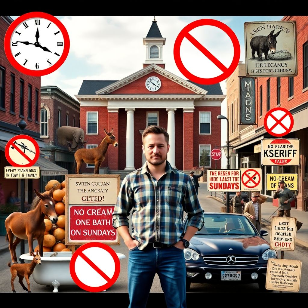 Путешественник отмечает, что уже первый найденный им пункт местного законодательства звучит как шутка. В Кентукки формально существует запрет купать осла в ванне после 19:00. Закон выглядит как анекдот, но когда-то он имел практический смысл: подобные нормы часто появлялись как реакция на конкретные жалобы соседей, случаи порчи имущества или попытки сэкономить воду и защитить канализацию от засоров. Со временем обстоятельства исчезли, а формулировка осталась в кодексе.